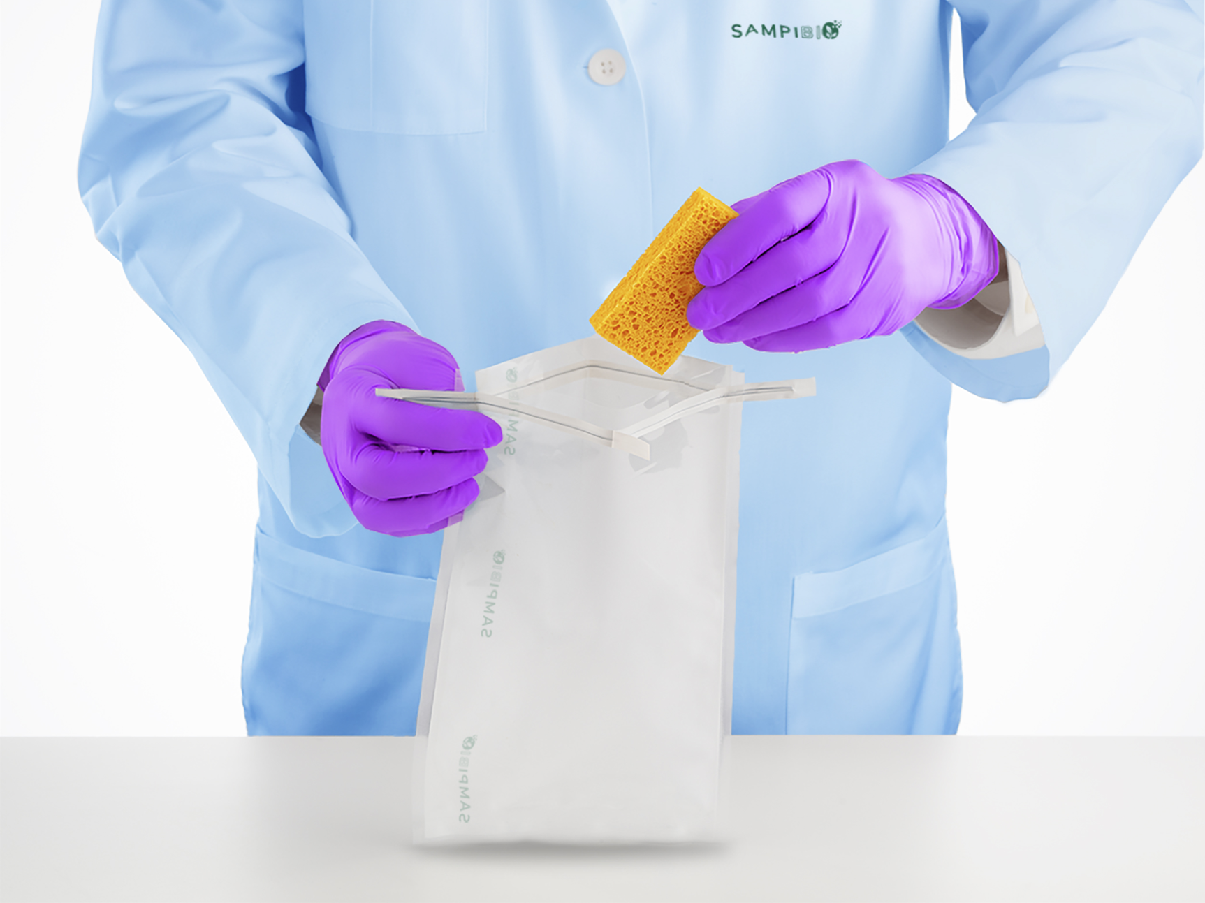 SAMPIBIO® Cellulose Sponge kits are supplied ready-to-use for direct surface sampling. Each sponge is sealed in a sterile, homogenization-tested bag with space for sample identification, supporting reliable traceability and laboratory processing.